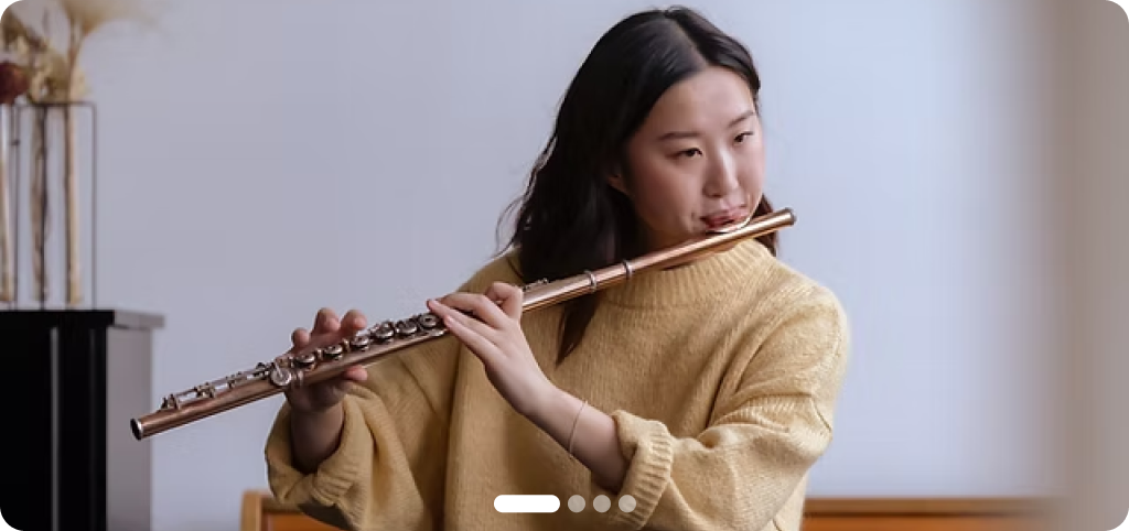 The biggest challenge when you start playing flute is learning the mouth shape, which is called the embouchure. You keep your lips small and relaxed and blow across the mouth hole, not into it. Imagine you’re cooling hot tea. Steady, even breaths will make a good sound!